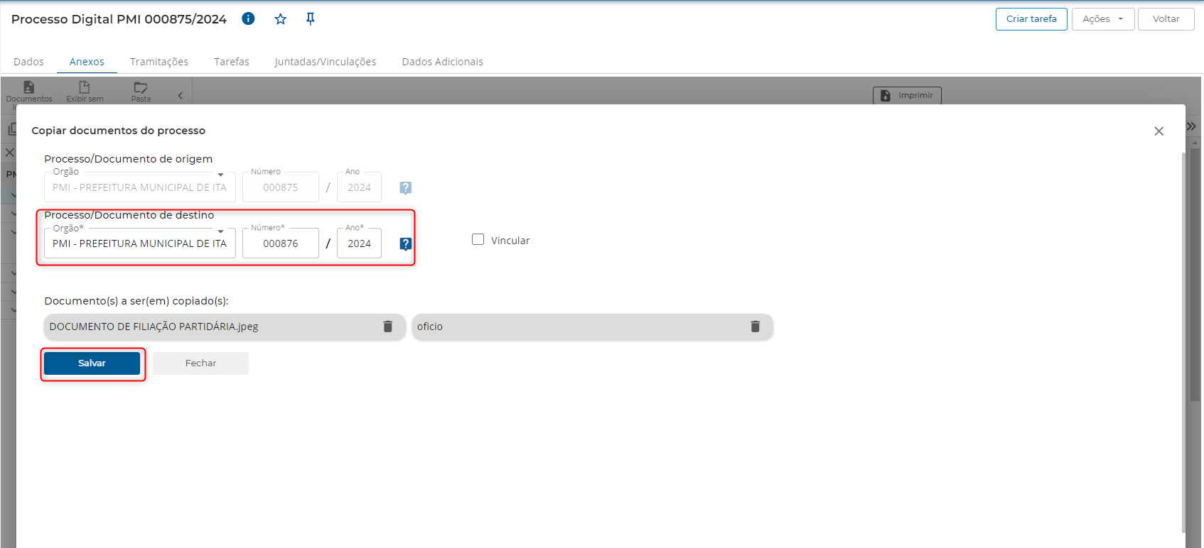 3. O número do processo de origem não poderá ser alterado, porém deve-se informar o número do processo destino para o qual os documentos serão copiados.