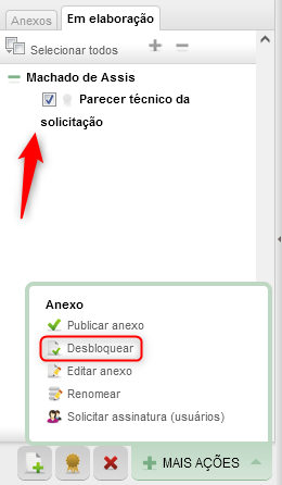5 – Finalizando as edições, você deverá aplicar as alterações realizadas no anexo. Para isso, clique em ‘Mais ações’ e, em seguida, em ‘Desbloquear’.